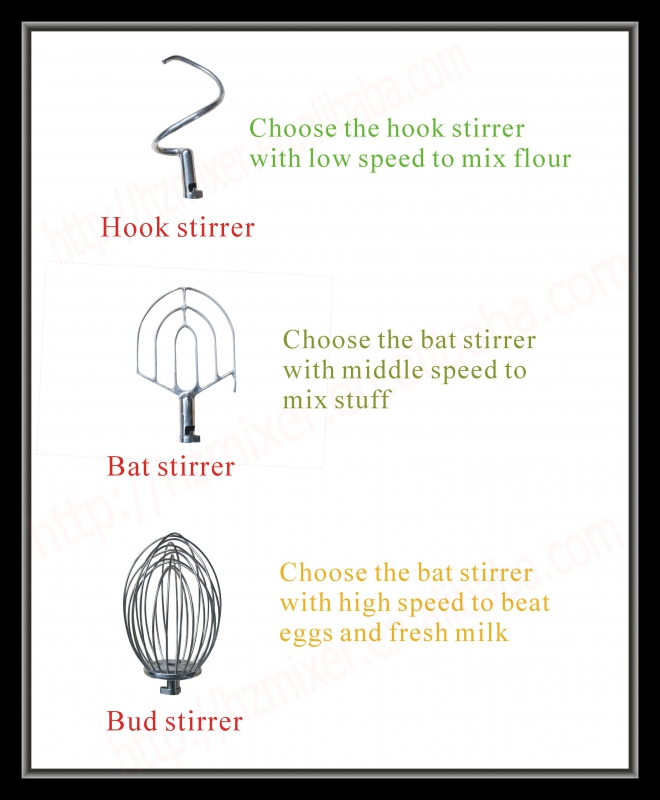 Use Bat stirrer to mix stuff,meat ,vegetable or fruit.Use Hook stirrer to mix dough to make bread,pizza .
