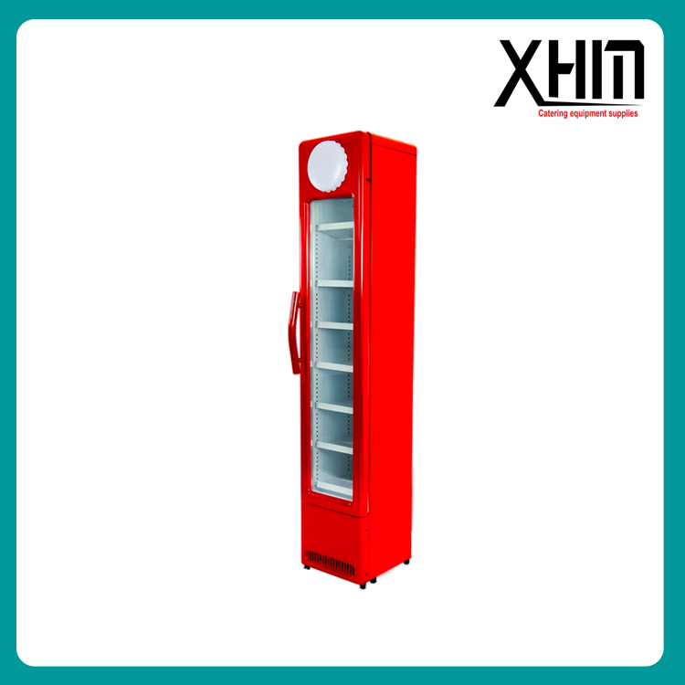 Striking Visual Appeal Red cabinet with standout white bottle cap detail on the lightbox and ergonomic handle creates strong shelf presence.