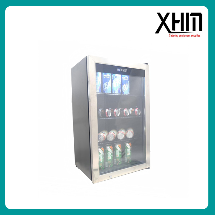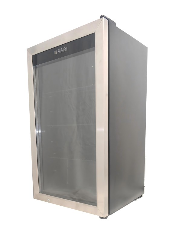 Premium 98L compact fridge with stainless steel door frame, ideal for bedrooms, offices, or small stores. Quiet, energy-saving, and fits global voltage needs. Adjustable shelves and lockable door available.